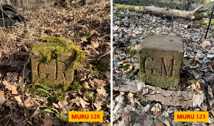 Nachtrag 3/25: Bei einem erneuten Besuch des Gebietes nördlich der Roten Warte bemerke ich, dass die Ostseite des Kuhmühlgrabens teilweise freigeschnitten war. Mit großer Mühe konnte ich dann die Steine NO 33 und NO 35 im Gestrüpp ca. 5 Meter vom Graben entfernt mit Hilfe von GPS finden. Stein No 37 steht auf einer Wiese, markiert und geschützt von einem Busch, während Stein NO 38 wiederum nur sehr schwer im Unterholz zu finden ist.