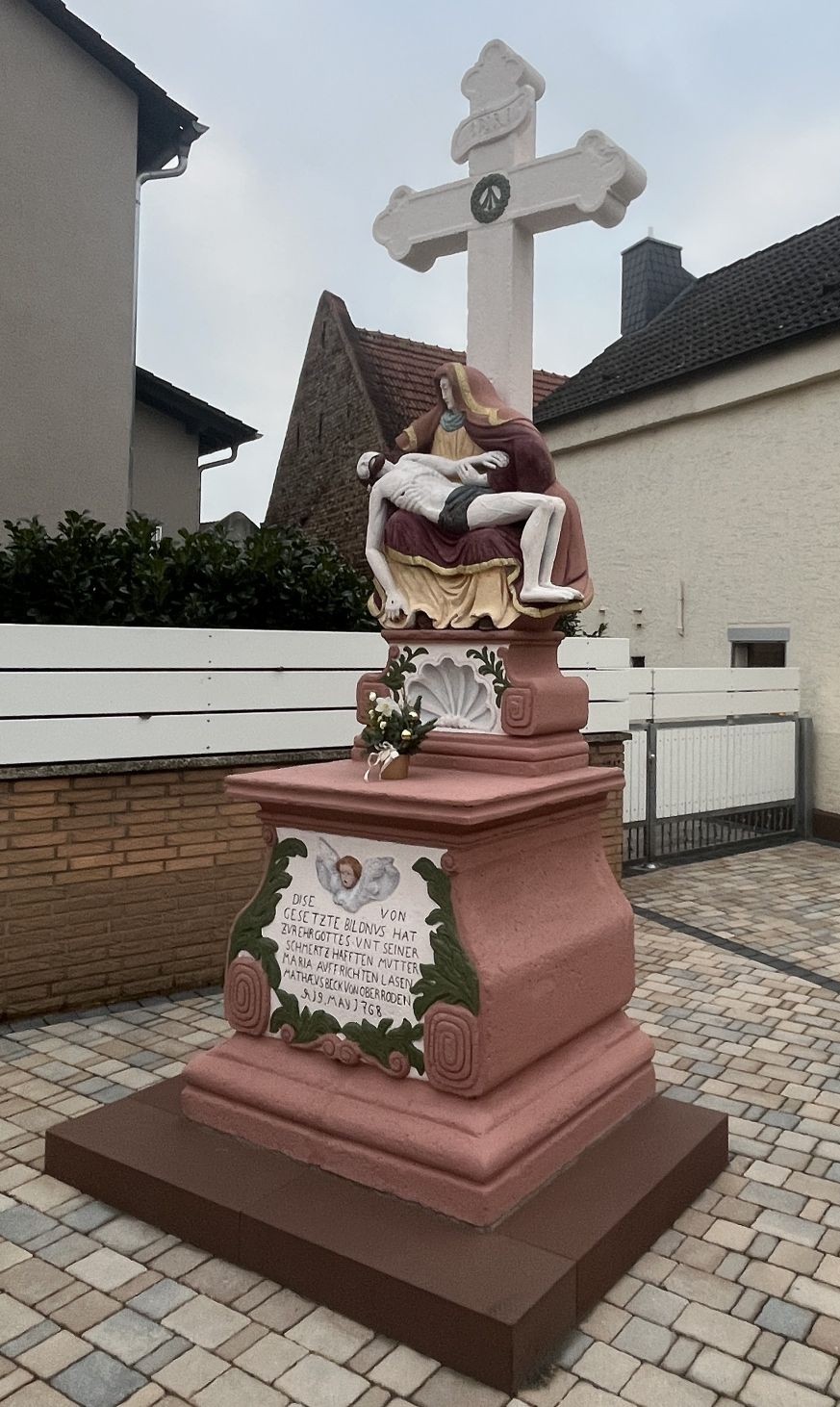 Es gibt noch einen anderen Aspekt. In dem sehr alten Eintrag in DenkXweb http://denkxweb.denkmalpflege-hessen.de/42205 ist zu lesen, dass der Sandstein unsachgemäß überstrichen sei. Vor der jetzigen Renovierung ist demnach die Farbe entfernt worden, so dass der Sandstein wieder schön sicht- und greifbar wurde. Es ist zu hoffen, dass in zehn Jahren nicht wieder zu lesen ist, dass die Ober-Rodener Pietá unsachgemäß überstrichen sei.